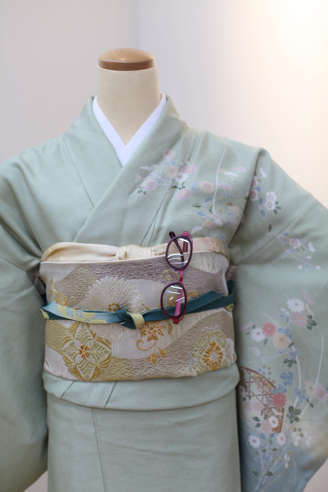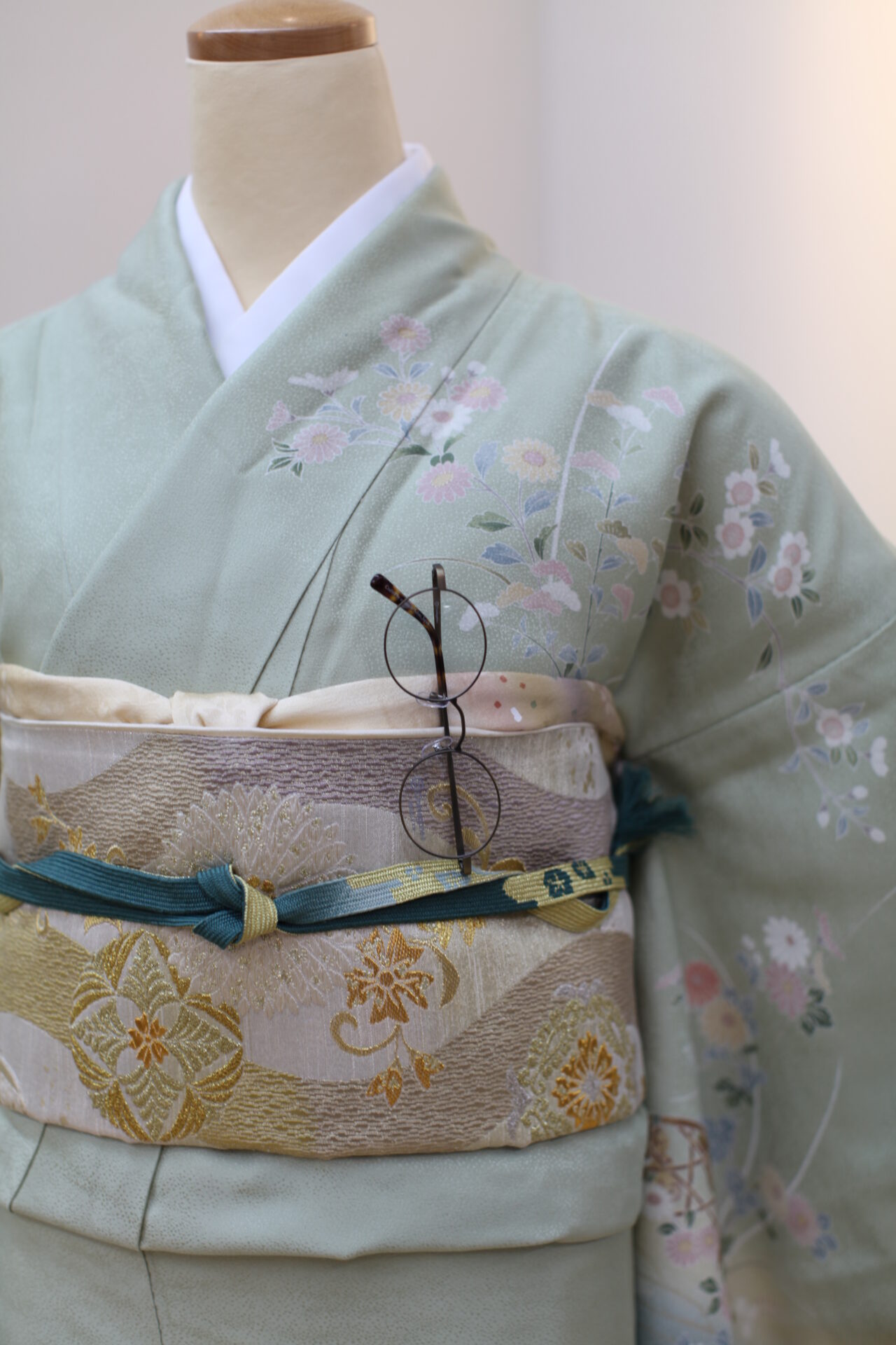 上品なイメージのグリーンには少しアンティークな色や素材の丸めがねを。丸いめがねも形や色にこだわればカジュアルになりすぎず、お着物にもよく合います!