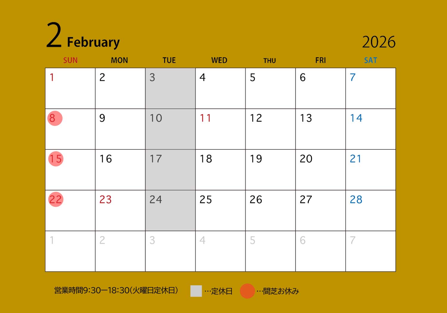 2月の営業カレンダー